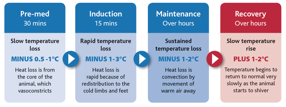Heat loss is exponential. Premedication causes mild hypothermia with dogs and cats typically losing up to 10C over 30 to 60 minutes before anaesthesia induction. This initial drop in core body temperature precedes the precipitous, critical heat loss of up to 40C that occurs in the first 15 to 30 minutes after induction during clip & prep time. Once animals are draped for surgery, heat loss slows.